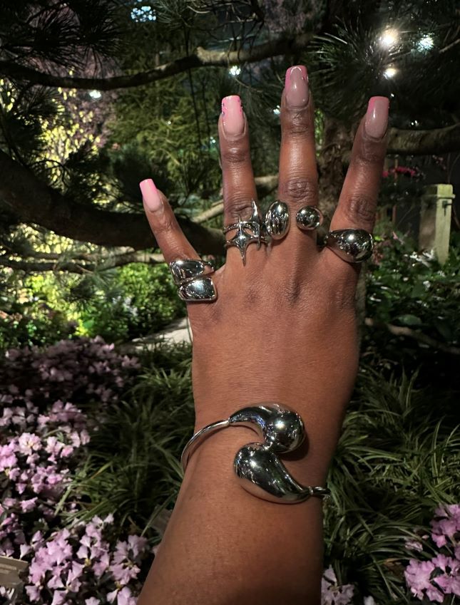 Lay Banks wears Shay Jewels Co Chrome Metallic Collection for her XXL freshman class performance. Styled by Devon Milan, Lay Banks wears tear drop bracelets, chunky tear drop bracelet and...